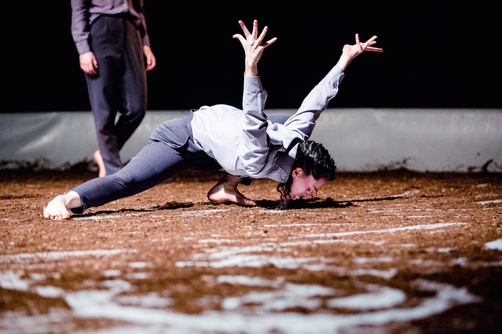 After more dirt was spread covering the stage, repetitive loud bangs in the score like gun shots invaded the theater space and jarred the senses. During this the dancers moved about drawing patterns in the dirt with their feet and kicking up dust clouds that, as in choreographer Pina Bausch’s famous The Rite of Spring (1975) with its dirt covered stage, the visual effect was dramatic but caused some audience members in the front rows to cough and a few to head for the exits.