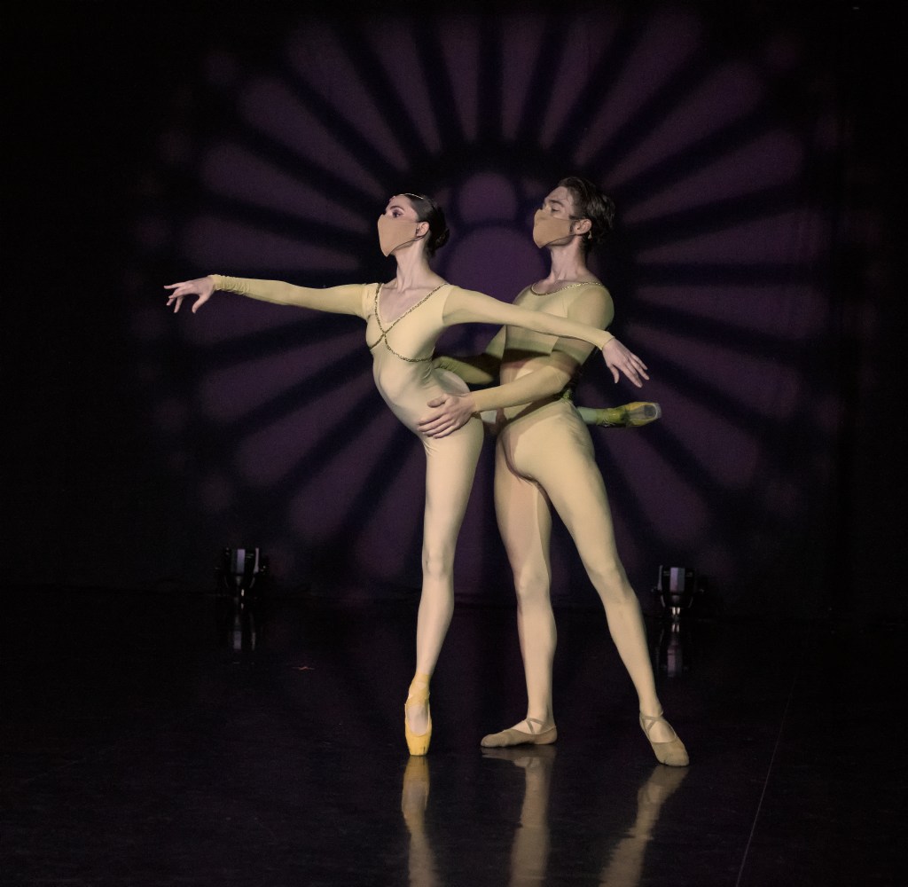 Danced to music from Beethoven’s String Quintet Op. 104 in C minor, Verb’s dancers in tan and white costumes with tan COVID-19 prevention masks, began the ballet in earnest matching Beethoven’s zippy opening music with dancing to match.