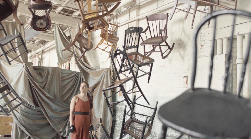 When the dancers enter a room with various chairs hung from the ceiling as a sculpture, the work’s surreal motif is complete.