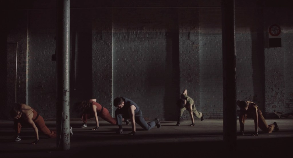 The film opened on two dancers behind the semi-transparent curtains of an empty office space dancing apart and that spun and bent the dancers to the ground. Soon they are joined by the other three dancers in the dark and moody atmosphere of the lifeless building. Costumed in street clothes with fingerless black gloves and wearing sneakers, the dancers surged and retreated in Brown’s contemporary dance movement that appeared tailored for GroundWorks’ preferred aesthetic.