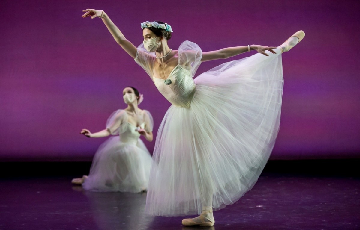 Filmed at the company’s Baumgartner Center for Dance, the on demand version of the production began with Jules Perrot’s quintessential classical ballet, Pas De Quatre (1845). Opening with one of ballet’s most recognizable tableaus, dancers Marie Harrison-Collins, twin sister Elizabeth Harrison, Lahna Vanderbush and Kristen Marshall costumed in white tutu dresses, flower headpieces and white COVID masks, were the picture of old-world femininity in ballet. The quartet performed Perrot’s choreography on pointe to music by Cesare Pugni with refinement and grace. Their buoyant arm movements and delicate footwork was captured nicely in camera work that respected the integrity of the ballet for a virtual audience’s viewing of it.
