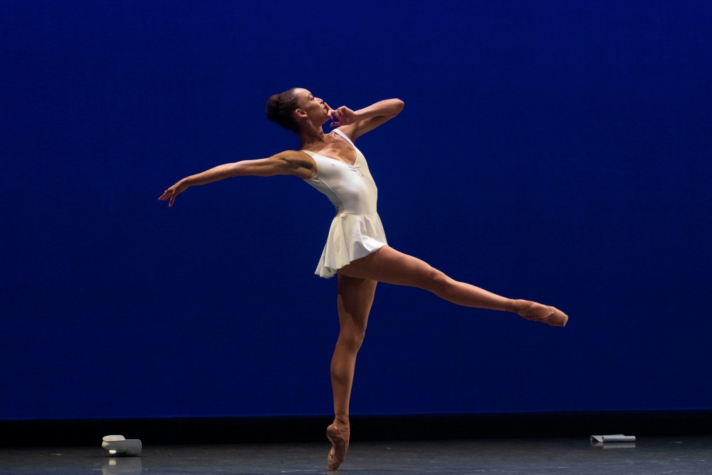 Balanchine’s familiar ballet played out per usual with Kapitonova as Calliope the first to appear. She silently mouthed poetry as she danced in front of an indifferent looking Apollo. Former Dancer Theatre of Harlem principal dancer Fentroy as Polyhymnia came next. Performing high leg lifts and arabesque poses with the finger of one hand pressed to her lips, Fentroy was delightful in her solo that ended with her ecstatically throwing both arms above her head and then being surprised and embarrassed by her actions. Apollo, equally surprised, threw out his arms stiffly in front of him in a stance that said to her “stay back.”