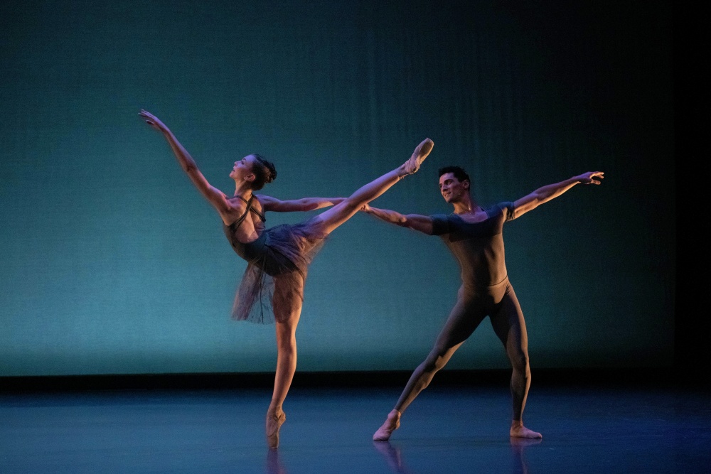 Performed by Addie Tapp and Lasha Khozashvili, the pas deux, danced to J.S. Bach’s Widerstehe doch der Sünde, BWV 54, had the feel of music box dancers in hyperdrive. Turn-filled with legs flying high, counterpoint pirouettes, and ballet positional poses, the contemporary ballet excerpt served as juxtaposition to Geroge Balanchine’s classic ballet Apollo (1928) that came next.