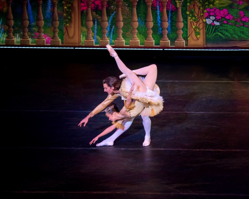 Differing from most traditional The Nutcracker productions where Caroline and her Prince arrive in a “Land of Sweets” to have representatives of various confections/lands dance for them, Guadalupe used the balloon to have the couple instead visit “Magic Lands” themselves to be entertained there. Their tour began in Spain with dancers Nashializ Gomez and Emmanuel Martirosyan in Spanish-inspired costume performing choreography a la Petipa and Ivanov’s original infused with Spanish folk dance movement. The pair, rather than dancing to the “Chocolate” music from Tchaikovsky’s Nutcracker score, instead performed to the “Spanish Dance: Allegro non-troppo” from Tchaikovsky’s score for the ballet Swan Lake. Their impactful performance was lively and delivered with Spanish flair.