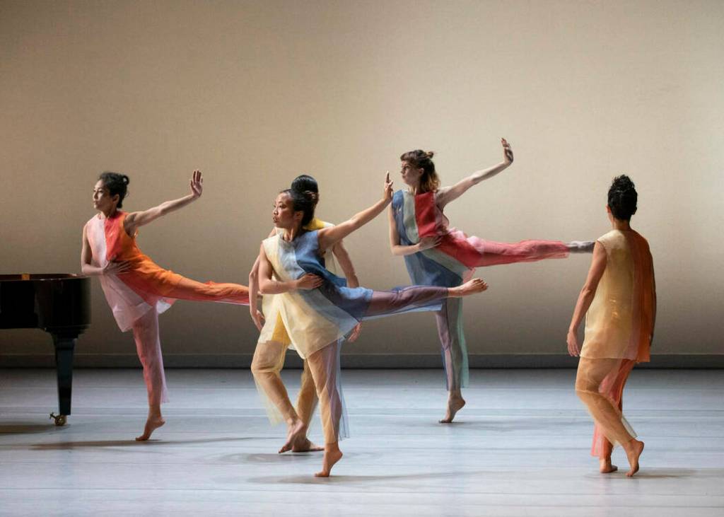 The dancers, costumed in long, semi-sheer linen and tulle tops with wide vertical stripes of various colors over gold leotards, mixed in their precise movement, the purity of modern and ballet dance technique with playful pedestrian actions such as looking as if kicking at an imaginary soccer ball. They mimicked tap dancing, skipped about, ran in place, and laid on the stage floor. All the while, Dinnerstein’s fingers, like the long legs of two spiders, danced across the piano keys creating aural magic.