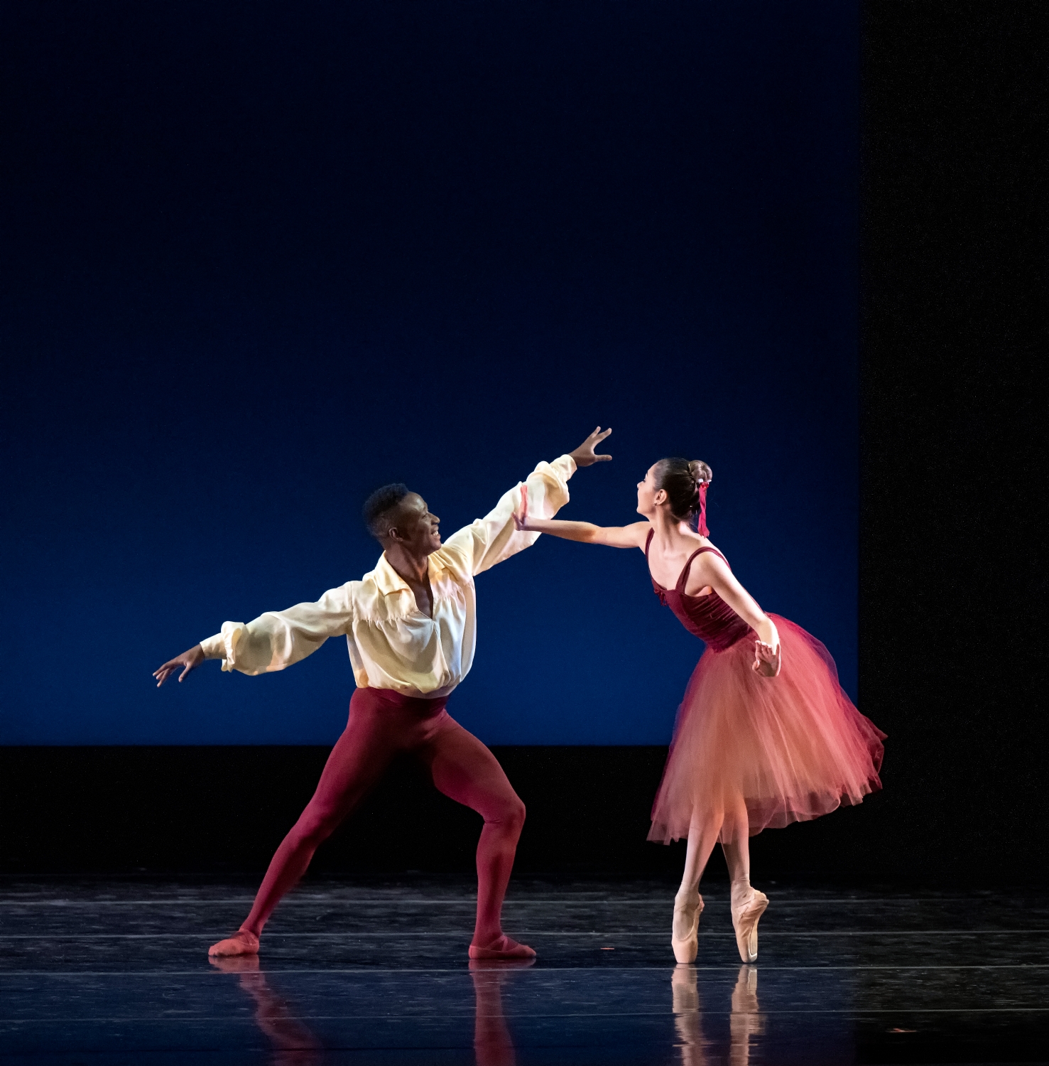 First up, the red couple of Kate Webb and Sikhumbuzo Hlahieni exuded the merriment of young lovers reveling in Poll’s challenging neo-classical choreography. In it, Webb powered through tricky direction-shifting dance phrases and Hlahieni showed off a barrage of jumps and leaps.