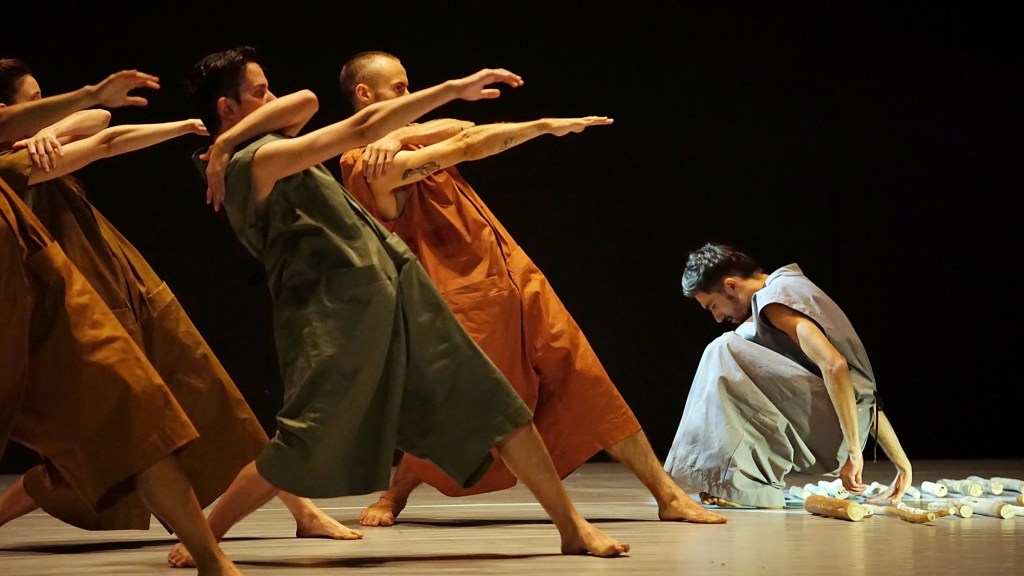 The uninterrupted 60-minute production opened on a darkened stage framed by three black stage curtains and dotted with piles of notched, branch-like wooden poles. In silence, Vertigo’s barefoot dancers filtered onto the stage wearing solid earth-tone colored costumes that resembled a cross between a baggy workwear jumpsuit and a romper. They picked up the wooden poles and relocated them; some were placed around the body of a dancer lying supine on the stage.