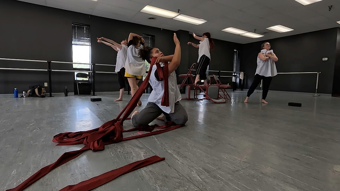 Walker’s twelve-minute work is divided into six sections and performed to a diverse score of music, soundscapes, and spoken word. Props, designed and created by Walker and Louis Grube, symbolize loss, obstacles faced, confinement, and societal structures that are individually defined and explored through the dancers’ unique narratives. The cast of six dancers entangle themselves, partner, improvise, and manipulate the space while using six chairs painted a vibrant red and long strips of crimson fabric.