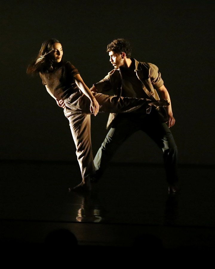 Apicella’s “Tardor” (the Catalan word for autumn) came next, offering up a stylistic change of pace. Set to music by Cristophe Fillipi and Lino Cannavacciuolo, the duet was performed by ARB Dance Company’s Flavio Altieri and Monica Cristiano. In it, each dancer, barefoot and costumed in street clothes, walked onstage and into individual spotlights. Within those spotlights, they began slowly performing gestural movements with their arms, which snaked around their heads as they lifted their legs and turned in place. As the spotlights faded, the dancers began moving with pace in unison, twirling and bending together and apart from one another.