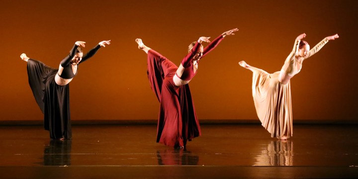 The 2019 trio “Mother’s Prism,” danced by Evelyn Aldrich, Madalyn McMorrow, and Maya Plummer, followed. Performed to piano music by Dustin O’Halloran, the work sought to unearth the many facets of motherhood. It began with each dancer costumed in differently-colored long skirts and matching crop tops dancing in place. The women bent and swayed together before expanding their movement outward on the stage and whirling like dervishes. Stylistically akin to dance works by José Limón and Martha Graham, Caruso’s back-and-forth choreography with repeated movements and complimentary hand and arm gestures had the feel of her version of a liturgical dance where feelings of hopefulness triumphed over those of emotional turmoil, letting the dancers’ souls soar.