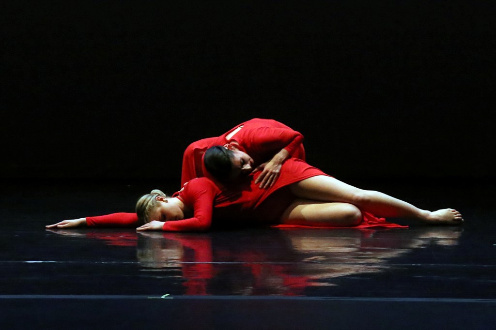 Next, Simeone and Isaac Ray performed the 2009 contemporary dance work “Intimate Liaisons.” Dancing to music by Kronos Quartet, the duet opened with Simeone lying on her back on the stage floor with her eyes closed. Kneeling over her, Ray somberly held one of her hands, then lifted Simeone’s seemingly unconscious body and began manipulating her limbs and moving her about the stage.