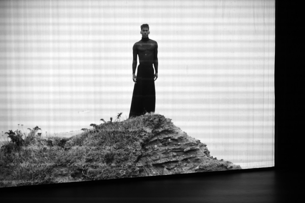 Costumed in a semi-sheer black top and floor-length skirt that the wind blew into motion, Knight stood still and stared distantly into the camera as he emerged live on the Westfield stage in the costume and began a series of poses a la Graham in many of her iconic dance works. Accompanying the movement was a repeated voiceover by Graham from the 1957 film A Dancer’s World, describing dance as “communication and the great desire to speak clearly and beautifully and with inevitability.” Also, there is the innate fear of the performer that “perhaps you have not done quite enough work. Perhaps you should have gone back to the studio and worked again because that which you don’t want to do is fail in either clarity or passion.”