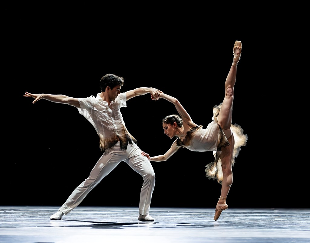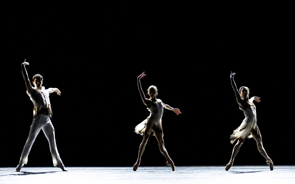 After an intertwining pas de deux by principal dancers Dylan Wald and Elle Macy, set to cinematic and desolate music infused with electronic ticks and clicks, the large groups of dancers returned, strutting their walks, arms back and leading with their feet, as they displayed bird-like postures while moving about the stage.