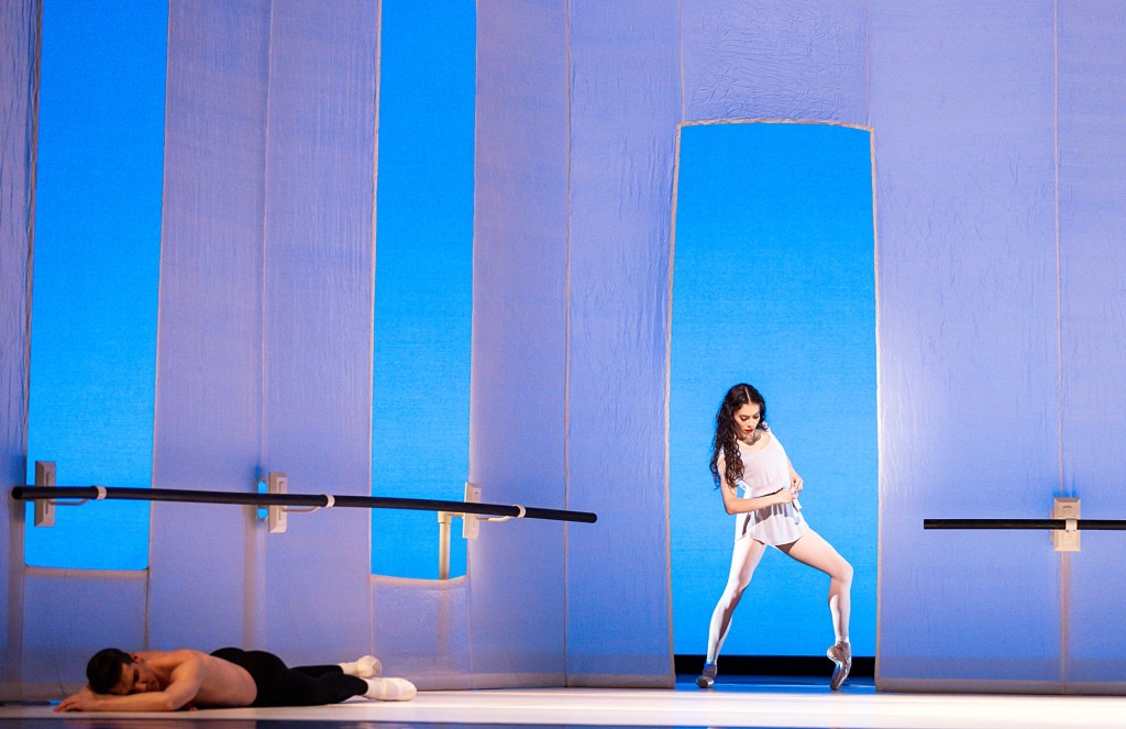 Danced to Claude Debussy’s “Prelude à l’Après-midi d’un Faune,” the 10-minute pas de deux took place within scenic and lighting designer Jean Rosenthal’s mock ballet studio set, complete with fabric walls, a marley floor, ballet barres, and in place of mirrors, the dancers directed their gazes out into the audience.