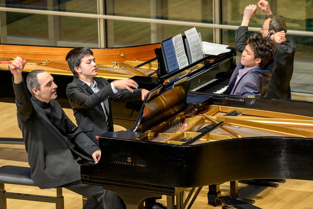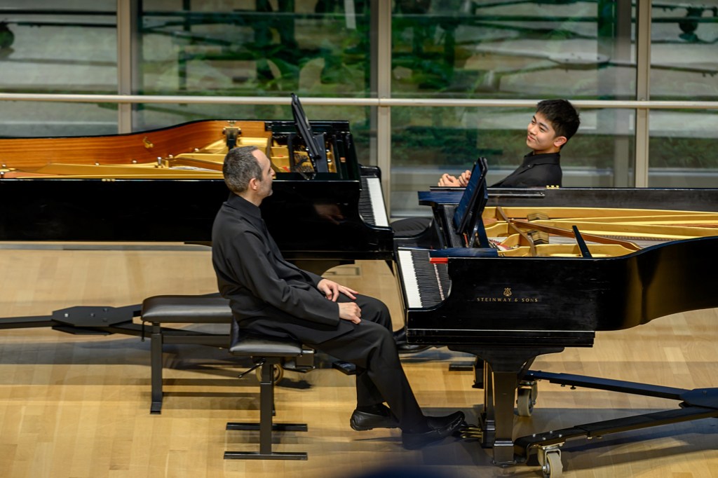 While all of the ten or so piano works on the program were played brilliantly and with flair by the students and CIM faculty, each with the pianists appearing to use their entire bodies to execute keystrokes, a handful of performances stood out for their energy, intensity, passion, and bravura playing. They included Pompa-Baldi and student Yau Nam Ng’s finger-flying, head-bobbing rendition of Rossini’s “William Tell Overture Finale” for one piano and four hands arranged by Louis Moreau Gottschalk; Robotkina performing with students Aidan Zhao, Xinran Shi, and Sophia Suwiryo in Charles Gounod’s audience-pleasing “Waltz from Faust” for two pianos and eight hands arranged by Renauld de Vilback; and students Peter Parra, Olivia Larco, Raditya Muljadi, and Xinran Shi performing a rapid-fire rendition of Sousa’s “Stars and Stripes Forever” for two pianos and eight hands arranged by Mack Wilberg.