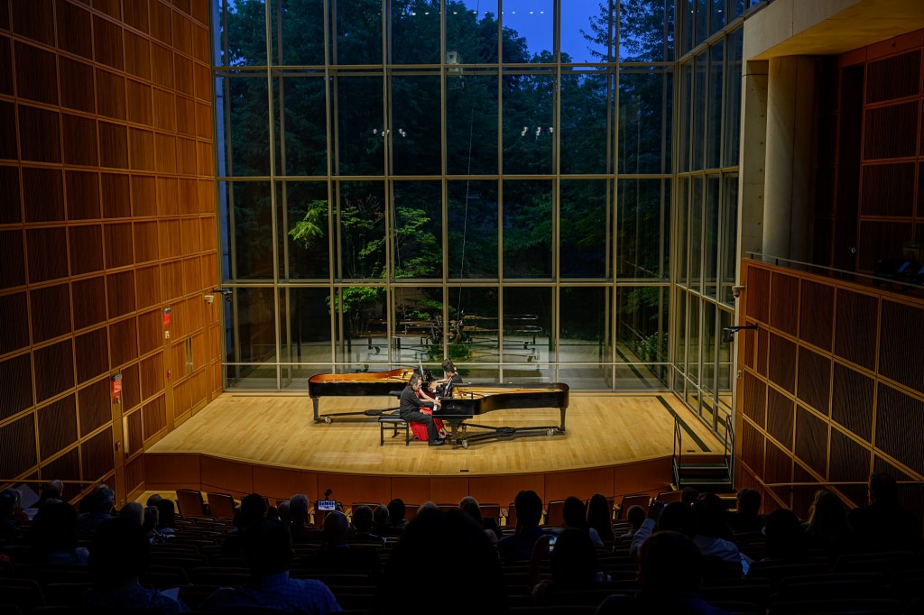 The performance, in the majestic wooden-walled Mixon Hall, with its picturesque stage backdrop of floor-to-ceiling windows revealing the outside trees and foliage, showcased compositions by Maurice Ravel, Gioachino Rossini, Wolfgang Amadeus Mozart, and John Philip Sousa, among others, played on one or two pianos with four to eight hands.