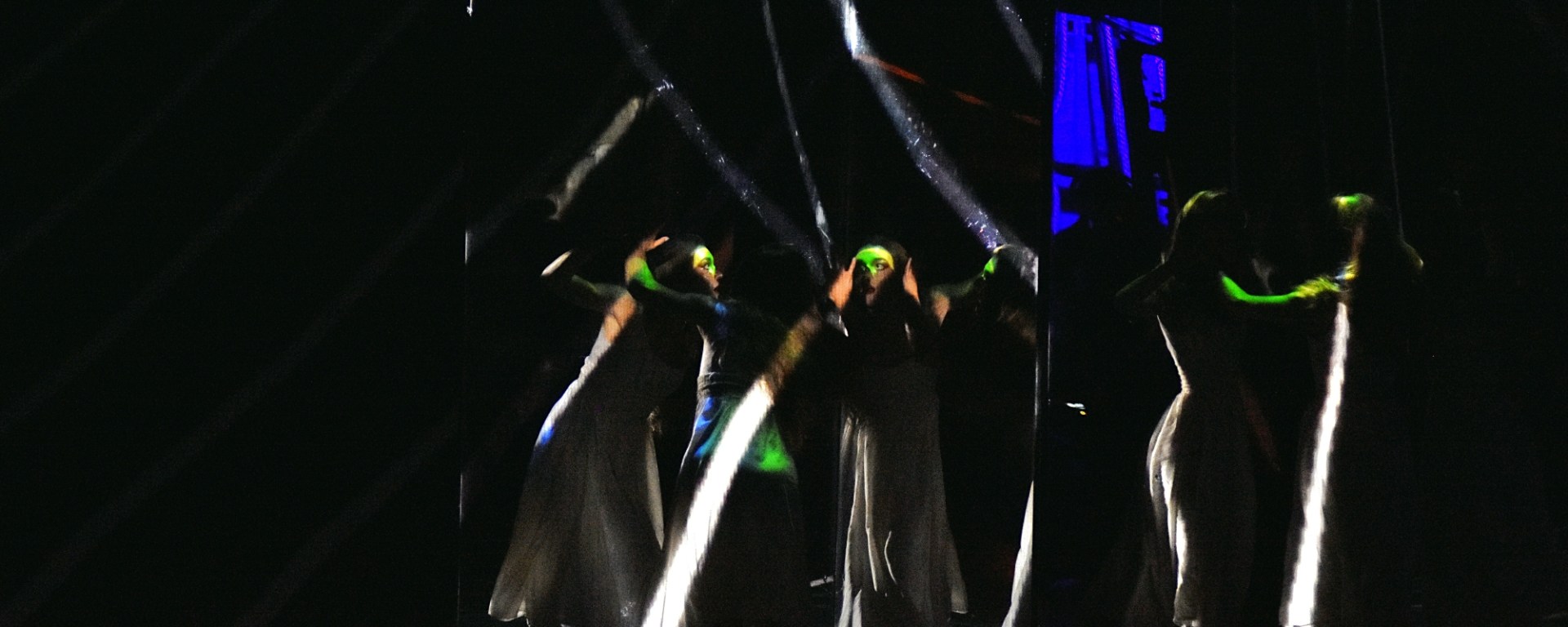 Alice concluded with the last of several scenes showing the many Alices growing shorter and taller. Here, Alice, surrounded by her counterparts, was raised up toward the rafters in a long, growing gown, as if ascending the rabbit hole in her mind back to the place where all her adventures begin.