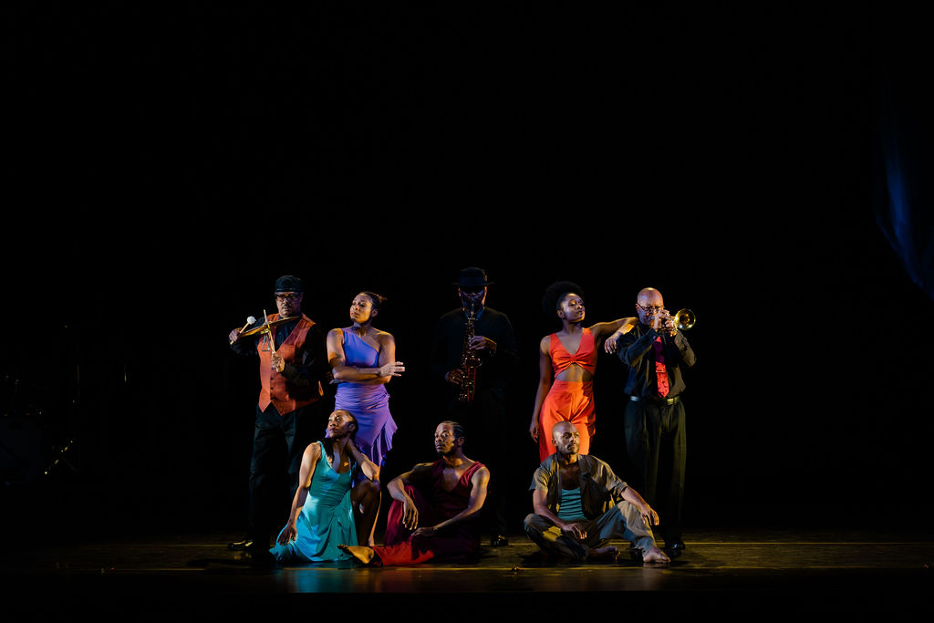 McIntyre’s voicoveers spoke of her childhood and her belief that people needed to hear her dancing to fully see it, of her coming of age in the 1960s during a period of revolution, where she fell in love with the new avant-garde jazz music and faced prejudice at the clubs where she went to experience it, and how dance and music’s relationship informed her career. Those voiceovers provided thematic material for several of the work’s vignettes, as did Shange’s poetry, which added another dramatic element to the work’s 16 vignettes.