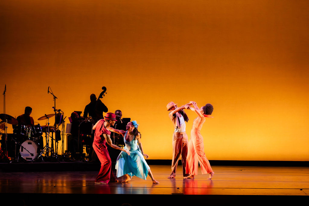The entire cast of company dancers, Rhodes, Spencer, Demetia Hopkins, Kyle H. Martin, and Kamryn Vaulx, wonderfully slipped into the groove of McIntyre’s choreography in vignettes that were predominantly upbeat and playful. A few of its most memorable sections, however, contained darker subject matter.