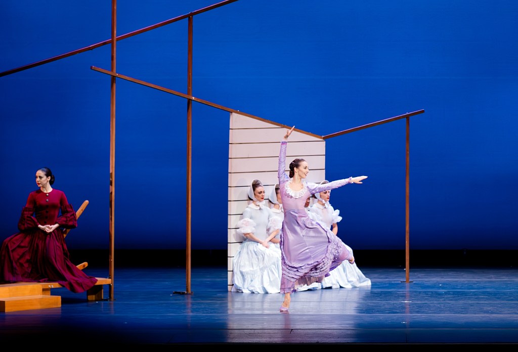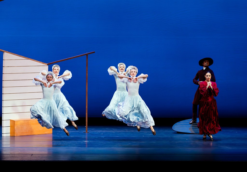 Costumed in prairie dresses and bonnets, the followers performed the bulk of Graham’s most whimsical and engaging choreography in the work, moving in square-dance patterns and executing paddle turns, curtsies, skips, and duck-walking with dress bottoms in hand.
