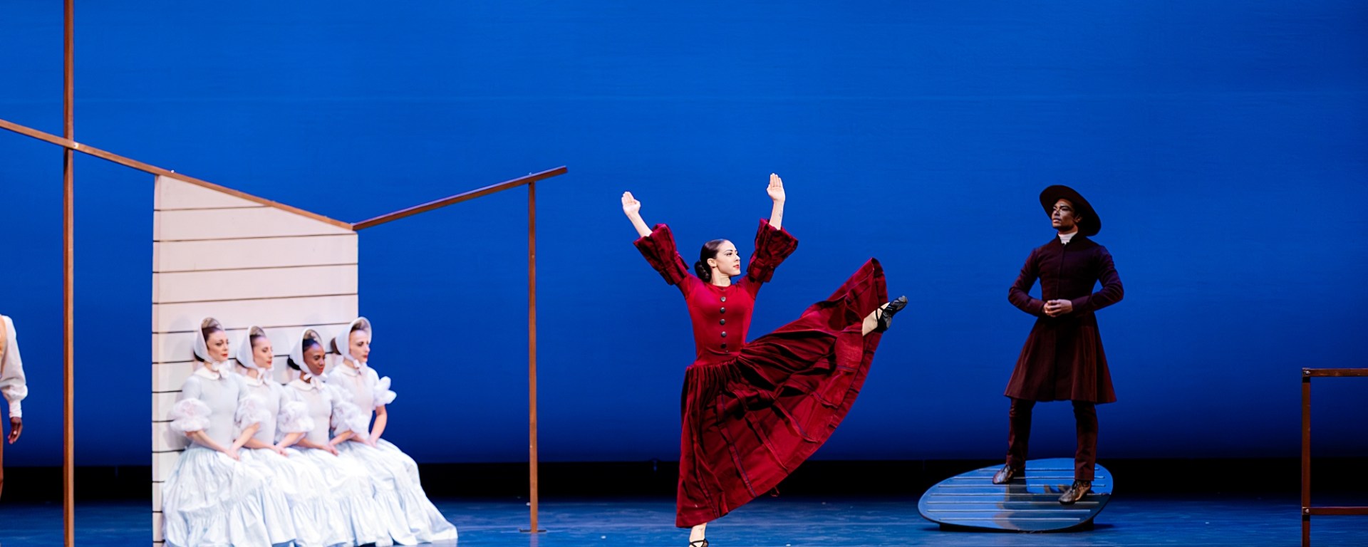 Danced on a minimalist set designed by Isamu Noguchi that featured a house outline, a fence, a bench, and a Shaker rocking chair, the work glimpsed the joy of the frontier couple dreaming of the future and starting a family, tempered by a devotion to God.
