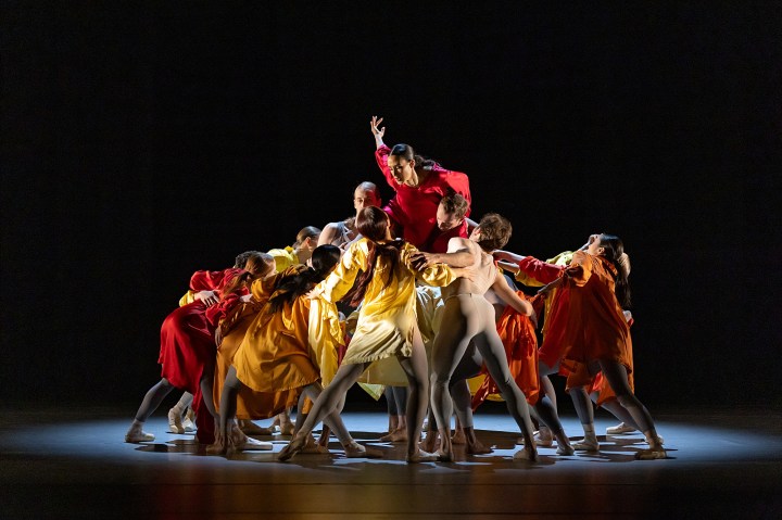 Stage fog billowed, casting atmospheric lighting evocative of fire over the stage as the trio of Katelyn Yang, Miguel Wansing, and Lorrio and Charles, costumed in yellow, began a flurry of expansive and expressive movement. They were part of a large cast of twenty-two, costumed in color-coded groups of red, orange, yellow, grey, and white that represented smoke, fire, and ash.